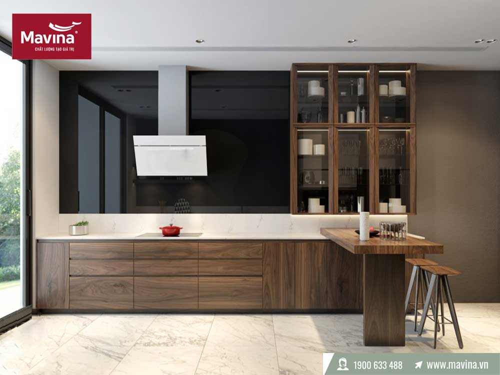 Đặc biệt, trong phong thủy, phòng bếp là nơi chứa nhiều yếu tố hỏa, vì vậy màu nâu trầm của gỗ óc chó sẽ là màu sắc hài hòa nhất cho không gian này.